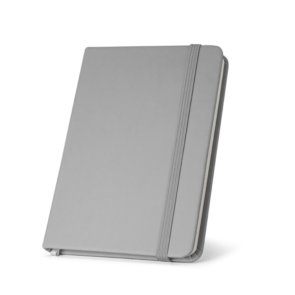 A5-Notizblock aus Pre-Consumer-Recycling-PU (35%) und PU (15%). Der harte Einband ist aus 100% recyceltem Karton hergestellt. Enthält 192 Seiten liniertes Papier, 100% recycelt, elfenbeinfarben, Trennstreifen und Gummiband zum Schließen des Notizbuchs. 138 x 210 mm