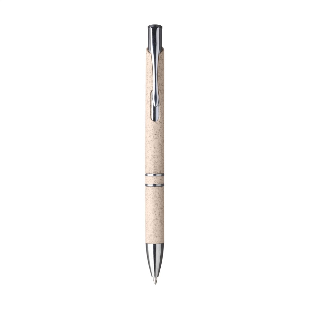 Blauschreibender Kugelschreiber mit Gehäuse aus 50% ABS und 50% Weizenstroh, Metallclip und Chromakzenten aus Kunststoff.