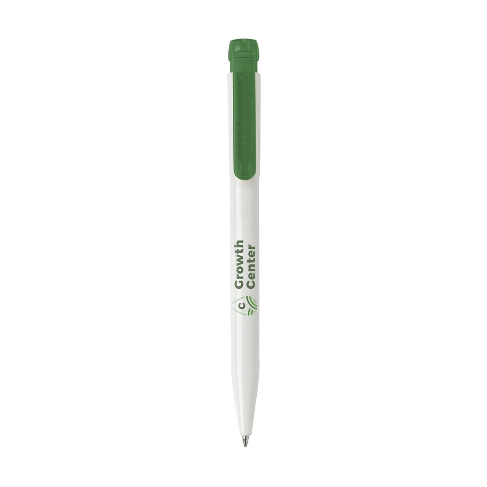 Blauschreibender Kugelschreiber der Marke Stilolinea®. Mit transparentfarbenem Clip/Druckknopf.... mehr