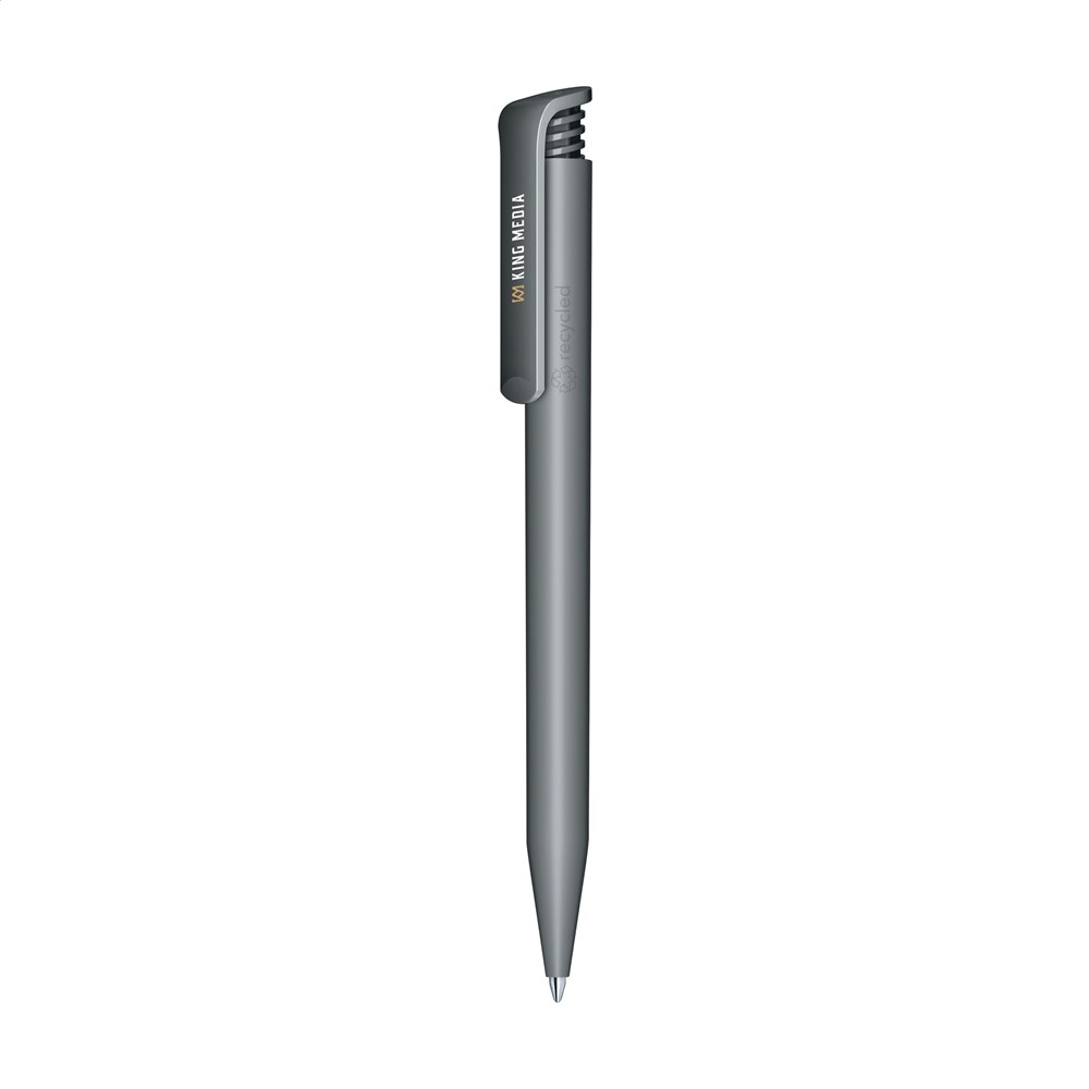 Blauschreibender Kugelschreiber der Marke Senator®. Hergestellt aus recyceltem Material. Dieser Kugelschreiber hat eine glatte, matte Oberfläche und einen großzügig bemessenen Clip/Druckknopf. Das Gehäuse ist neben dem Clip mit dem kleinen Symbol für „aus recyceltem Material“ bedruckt. Aufgrund des verwendeten Recyclingmaterials kann es zu leichten Unregelmäßigkeiten in der Oberfläche des Kugelschreibers kommen. Made in Germany.