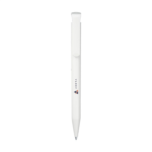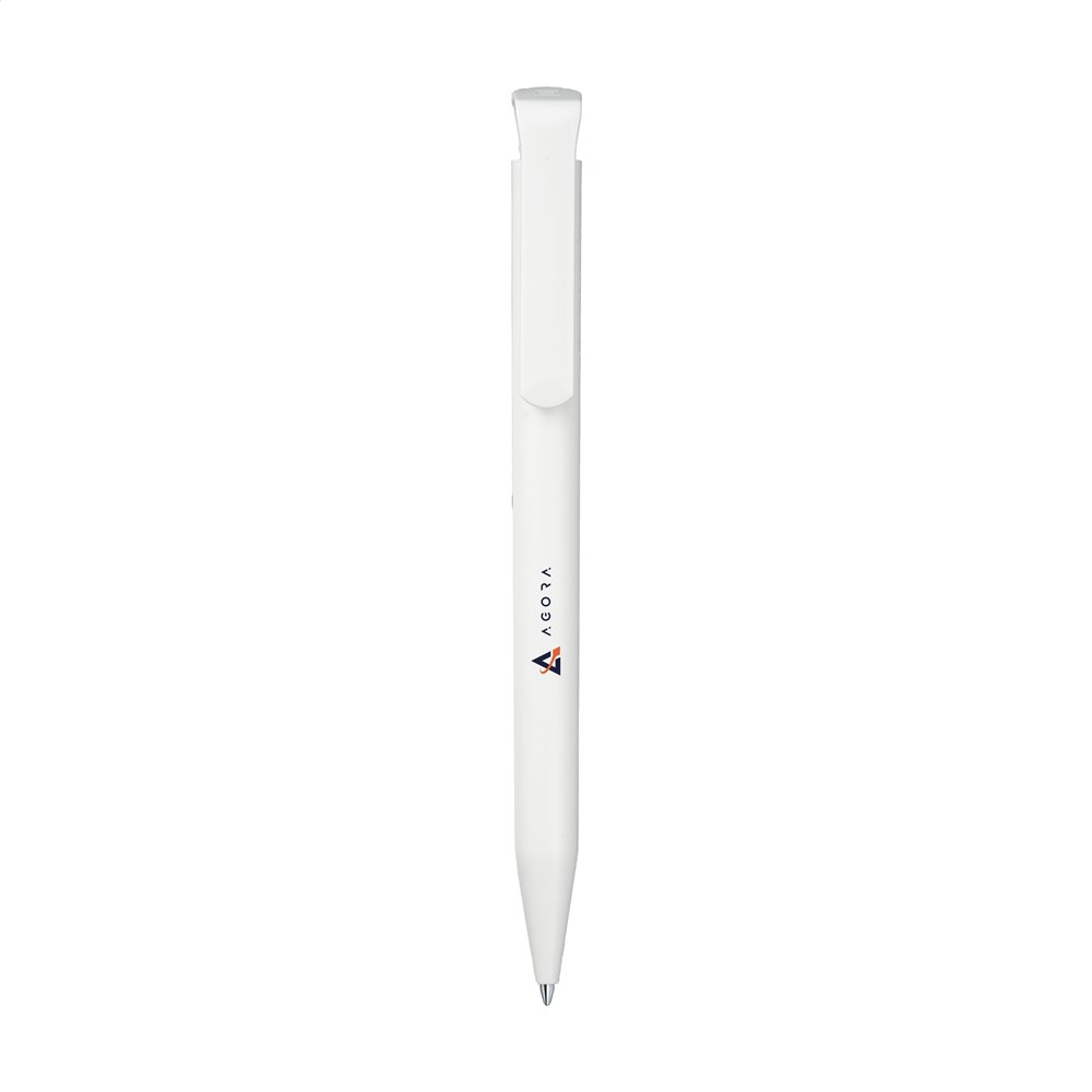 Blauschreibender Kugelschreiber der Marke Senator®. Hergestellt aus recyceltem Material. Dieser Kugelschreiber hat eine glatte, matte Oberfläche und einen großzügig bemessenen Clip/Druckknopf. Das Gehäuse ist neben dem Clip mit dem kleinen Symbol für „aus recyceltem Material“ bedruckt. Aufgrund des verwendeten Recyclingmaterials kann es zu leichten Unregelmäßigkeiten in der Oberfläche des Kugelschreibers kommen. Made in Germany.