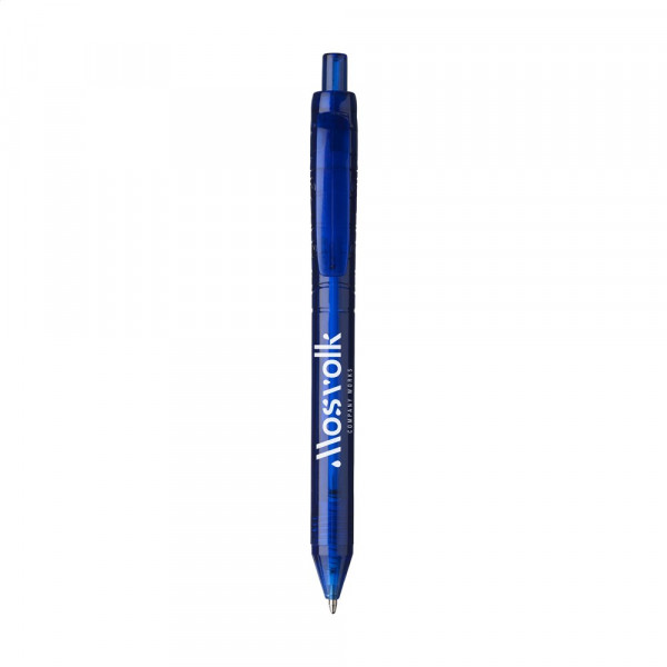 Blauschreibender Kugelschreiber mit transparantem Gehäuse hergestellt aus 100% recyceltem PET. GRS-zertifiziert.