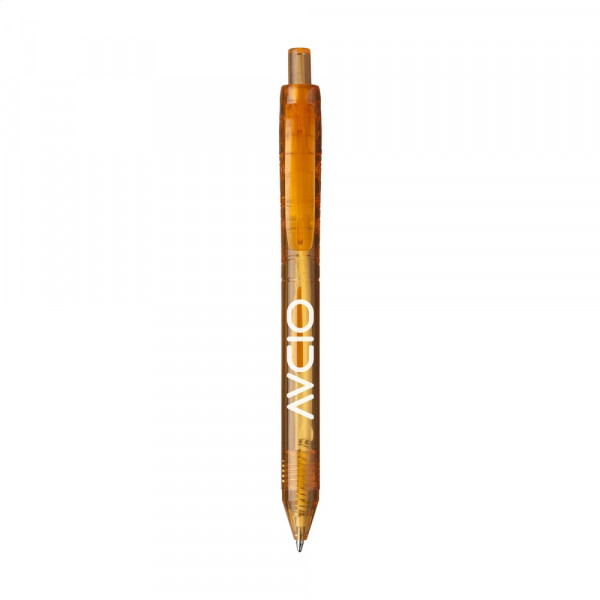 Blauschreibender Kugelschreiber mit transparantem Gehäuse hergestellt aus 100% recyceltem PET. GRS-zertifiziert.