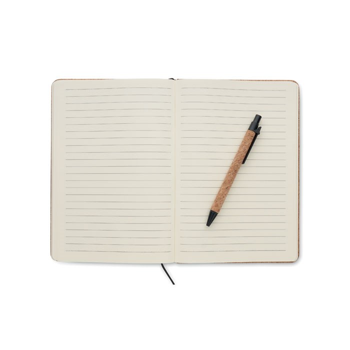 DIN A5 Dokumentenmappe mit Kork. DIN A5 Notizbuch mit gebundenem Hard Cover. 96 Blatt (192 Seiten ) liniertes Recyclingpapier. Großes Fach und 2 Kartensteckfächer. Passender Stift und Stiftschlaufe. Elastisches Verschlussband.