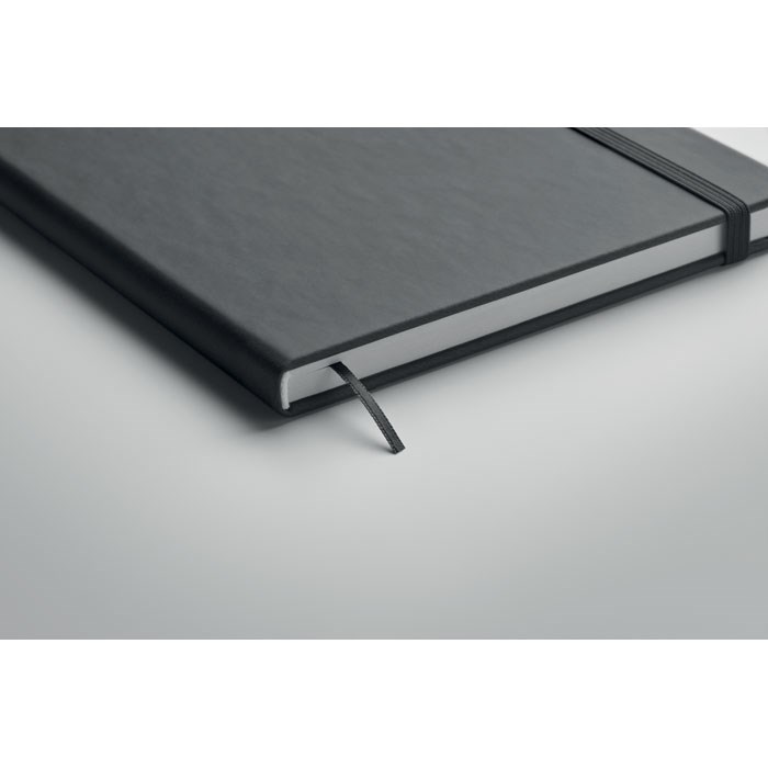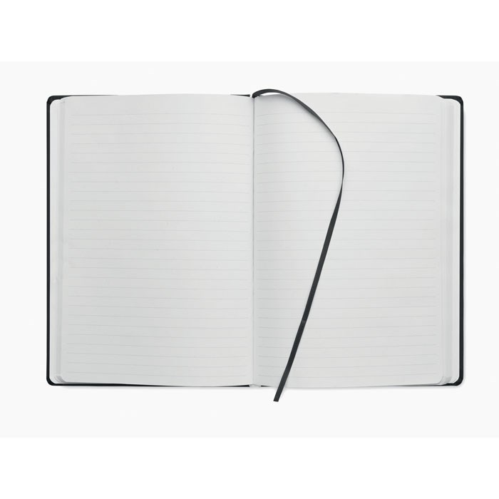 DIN A5 Notizbuch mit Hard Cover aus PU. 100 Blatt (200 Seiten) liniertes Recyclingpapier (80 g/m²). Farblich passendes elastisches Verschlussband und Lesebändchen. Hergestellt in der EU.