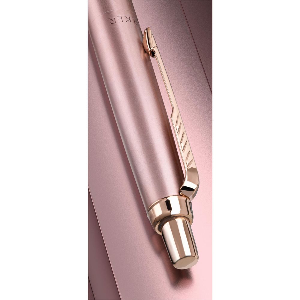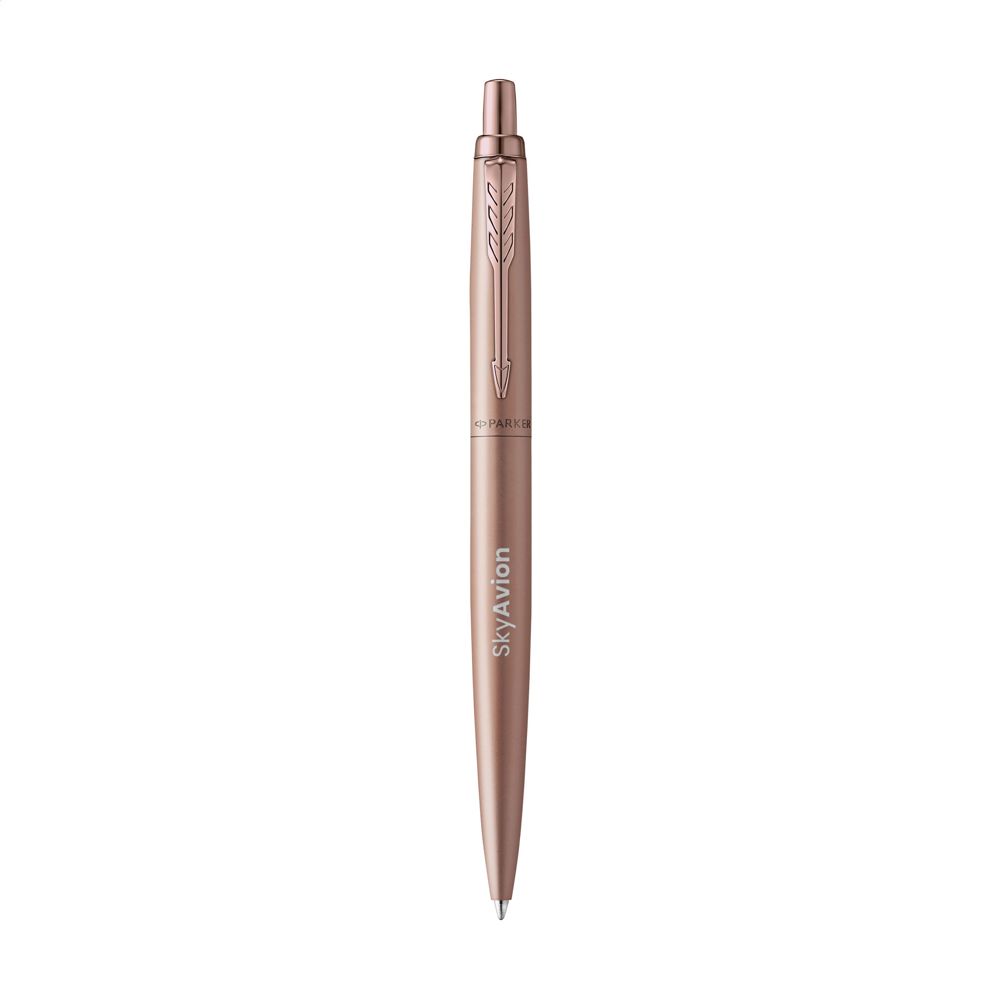 Blau schreibender Kugelschreiber der Marke Parker. Erhältlich in einem vollständig goldfarbenen oder roségoldfarbenen Edelstahlgehäuse mit mattem Gehäuse und glänzenden Metallakzenten wie dem Druckknopf und dem ikonischen federnden Pfeilclip. Diese XL-Ausführung bietet alle Merkmale des ikonischen Jotter, ist jedoch größer gestaltet. Länge und Durchmesser sind um 7% erhöht, was ein angenehmes Schreibgefühl für alle bietet, die einen größeren Kugelschreiber bevorzugen. Ausgestattet mit einer Parker-Mine für ein geschmeidiges und gleichmäßiges Schreibgefühl. Ein elegantes und exklusives Modell, das durch seine raffinierte Optik und stilvolle Farbauswahl besticht. Geliefert in einer Parker-Geschenkbox. Hergestellt in Europa.