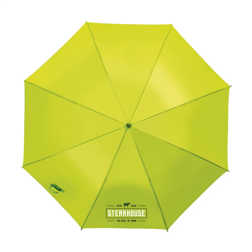 Regenschirm mit automatischer Teleskopöffnung, 190T Polyester-Bespannung, Fiberglasrahmen, Metallschaft, Softgriff und Klettverschluss.
