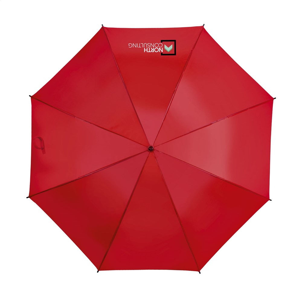 Regenschirm mit automatischer Teleskopöffnung. 190T Polyester-Bespannung, Fiberglasrahmen, Metallschaft, Klettverschluss, gebogenem, klassischem Handgriff, der durch die luxuriöse Gummiummantelung gut in der Hand liegt.