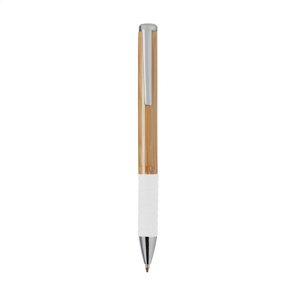 Blauschreibender Kugelschreiber mit Gehäuse aus Bambus, Metallclip, Dreh-Klicksystem und farbigem, gummiertem, grifffestem Vorderteil.
