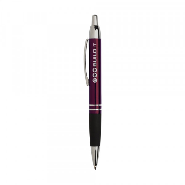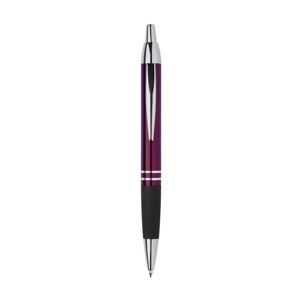 Blauschreibender, metallener Kugelschreiber mit hochglänzendem Gehäuse in Metalloptik, gummierte Grifffläche, fester Metallclip und Druckknopf und silberfarbene hochglänzende Akzente.