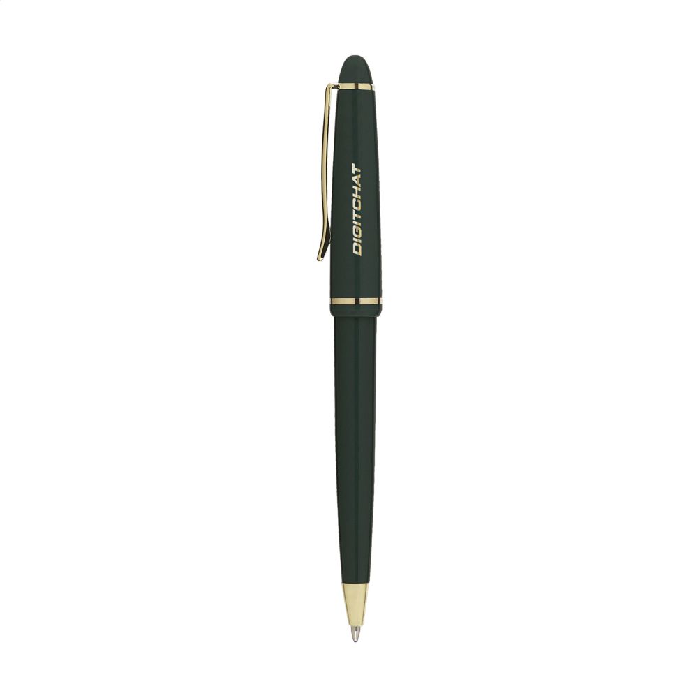 Blauschreibender Kugelschreiber mit poliertem Gehäuse, vergoldetem, zierlichem Clip und Spitze und Druckkappensystem.