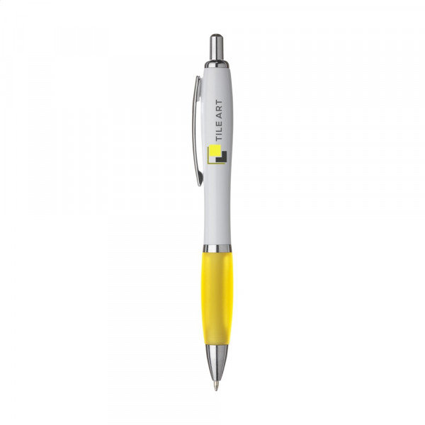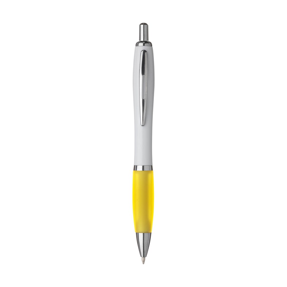 Blauschreibender oder schwarzschreibender Kugelschreiber mit weißem Gehäuse, farbigem, grifffestem Vorderstück und Metallclip.