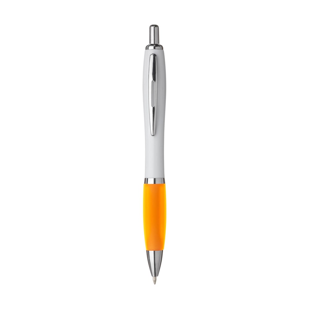 Blauschreibender oder schwarzschreibender Kugelschreiber mit weißem Gehäuse, farbigem, grifffestem Vorderstück und Metallclip.