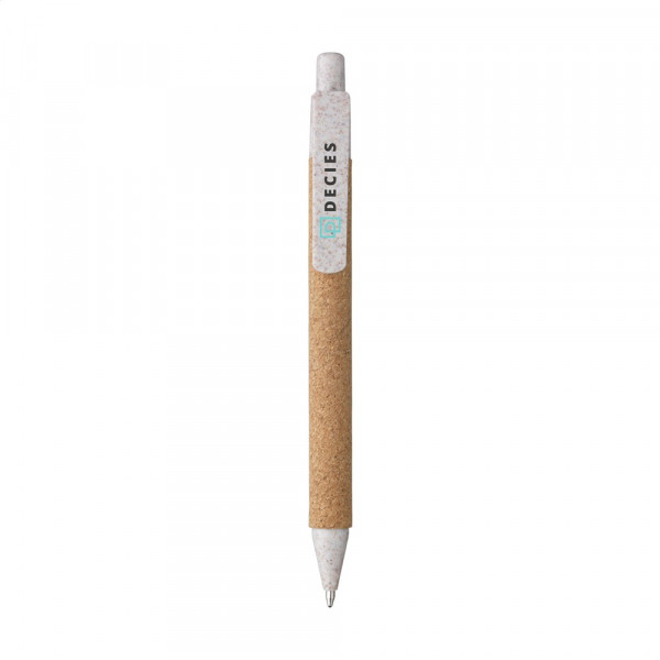Blauschreibender Kugelschreiber mit Korkgehäuse. Die Spitze, die Oberseite, der Druckknopf und der Clip bestehen aus 50% PP und 50% Weizenstroh. Teilweise biologisch abbaubar.