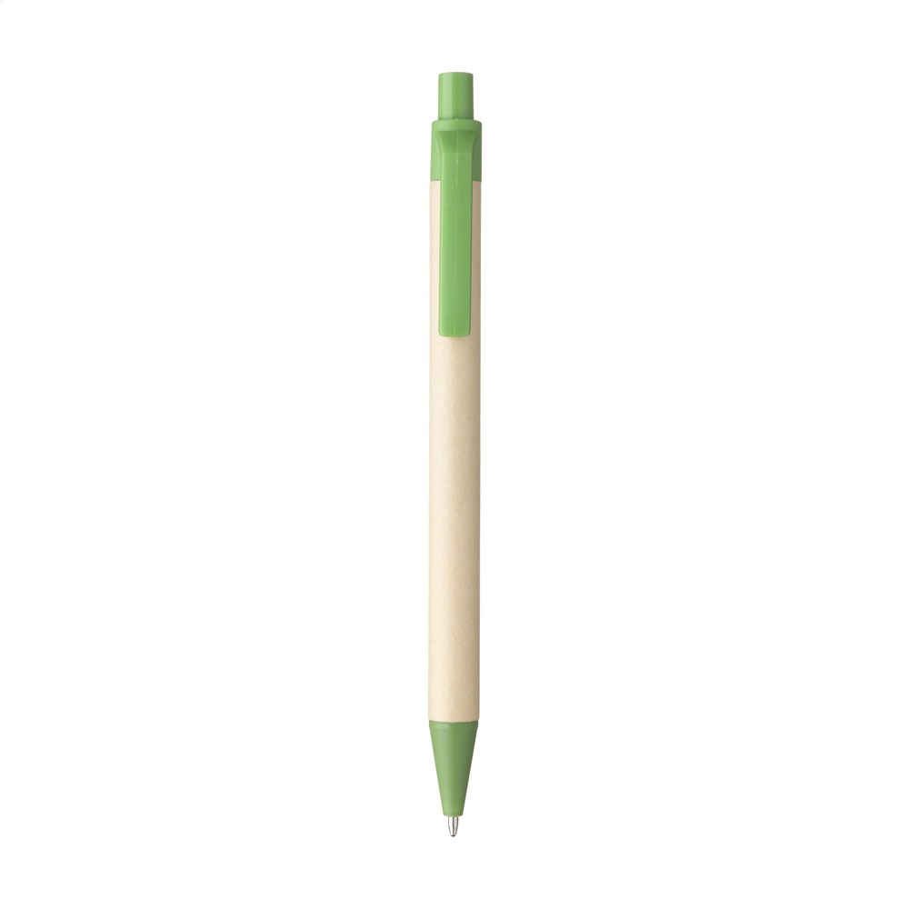 Kugelschreiber mit Halter aus Recyclingpapier. Der farbige Clip, der Druckknopf und die Spitze bestehen aus biologisch abbaubarem PLA. Mit blauer Tinte.