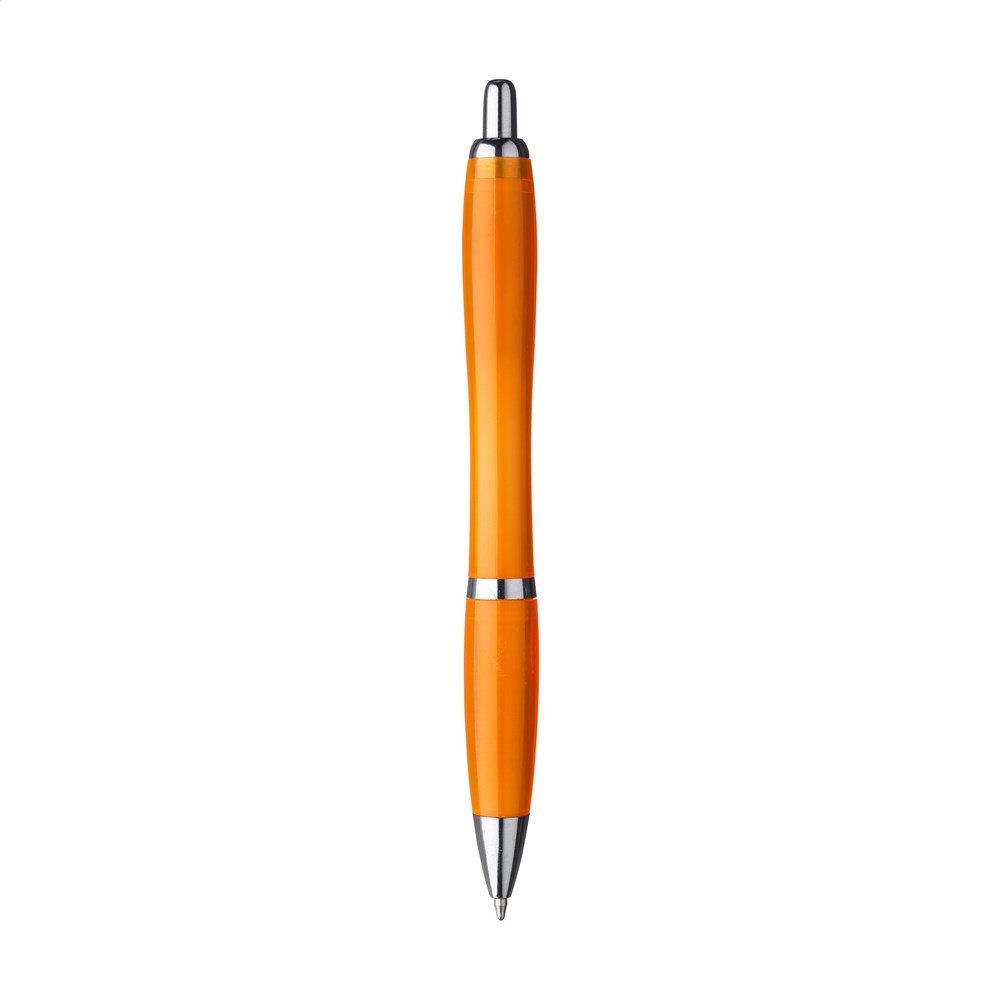 Blauschreibender Kugelschreiber mit transparentem Gehäuse hergestellt aus 100% recyceltem PET. Mit Hochglanzakzenten und Metallclip.