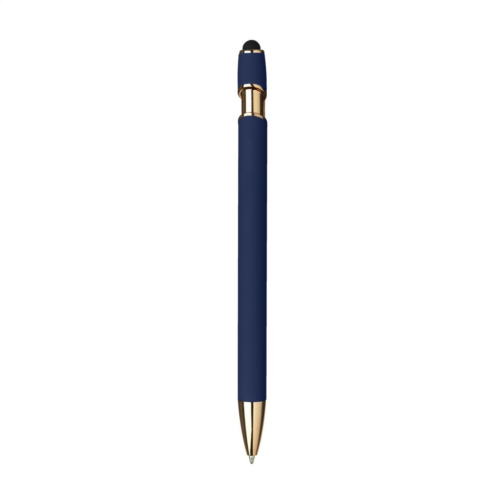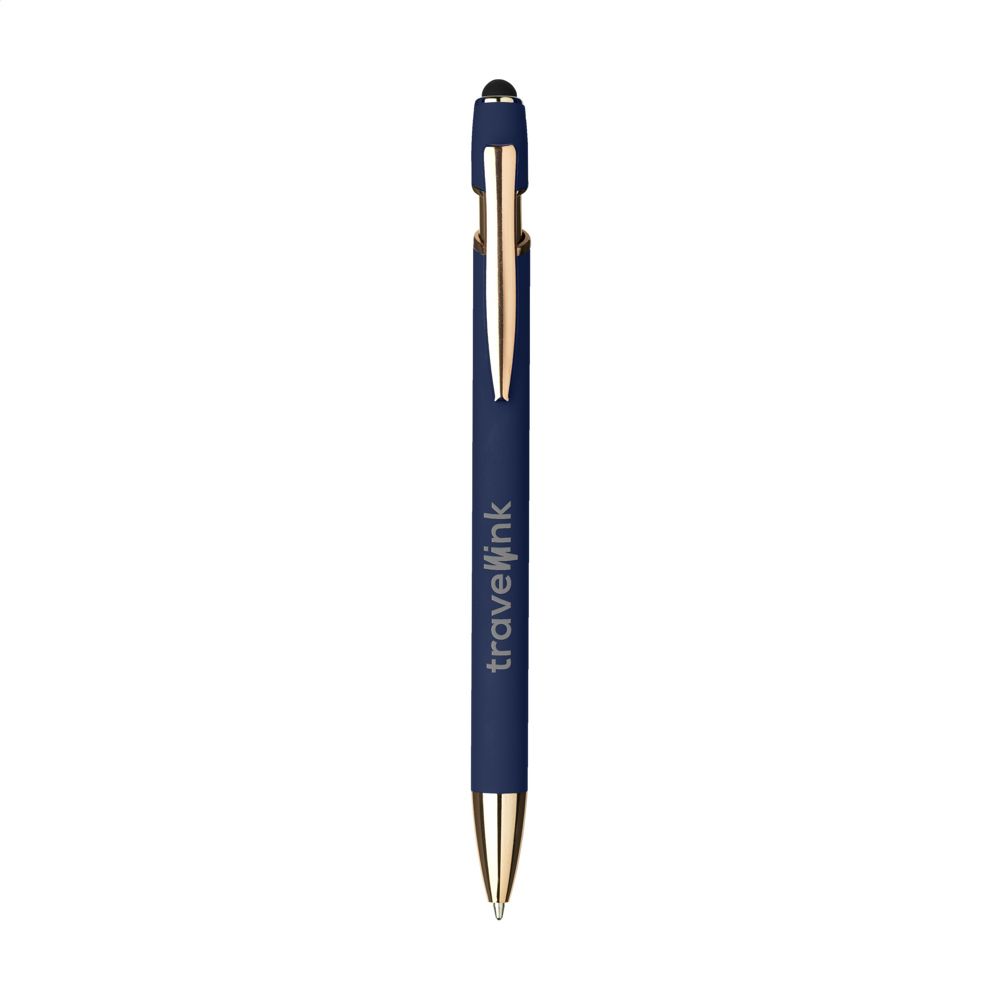 Blauschreibender Kugelschreiber mit Gehäuse aus recyceltem Aluminium und einer Kupferlegierung. Die roségoldenen Akzente verleihen dem Stift ein elegantes Aussehen. Das Gehäuse ist mit einer gummierten Soft-Touch-Oberfläche und einer gummierten Spitze/Zeiger zum Bedienen von Touchscreens versehen. Mit Metallclip. RCS-zertifiziert. Gesamtes recyceltes Material: 94%. Hergestellt in Europa. Durch die Verwendung von recyceltem Aluminium werden bei der Herstellung dieses Produkts weniger neue Rohstoffe verwendet. Das bedeutet weniger Energieverbrauch und weniger Wasserverbrauch.