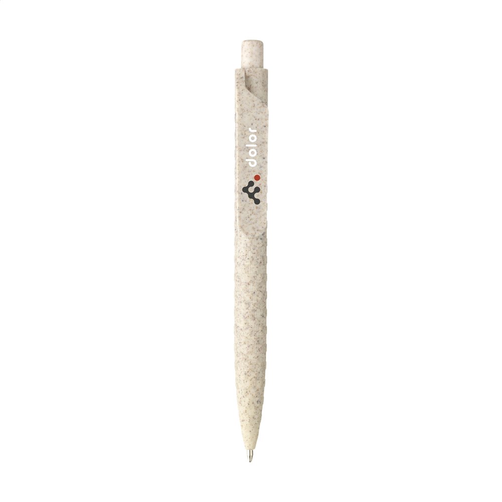 Umweltfreundlicher, blauschreibender Kugelschreiber, hergestellt aus 60% Weizenstroh und 40% ABS. Griff, Clip und Druckknopf sind aus den Resten geernteter Weizenstängel gefertigt. Mit großzügigem Clip für auffälligen Aufdruck.