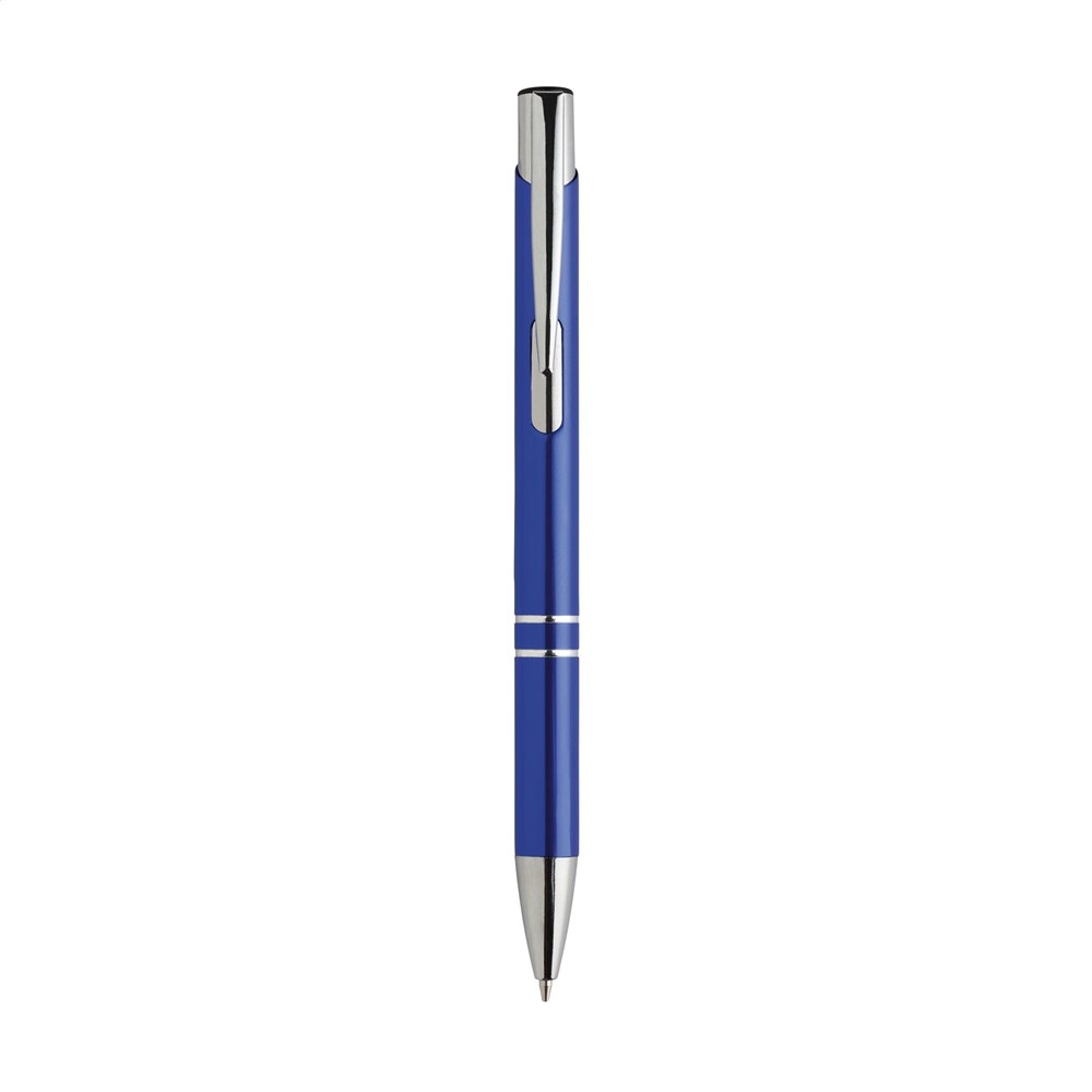 Blauschreibender Aluminiumkugelschreiber mit glänzendem Gehäuse in Metalloptik und metallenem Clip.