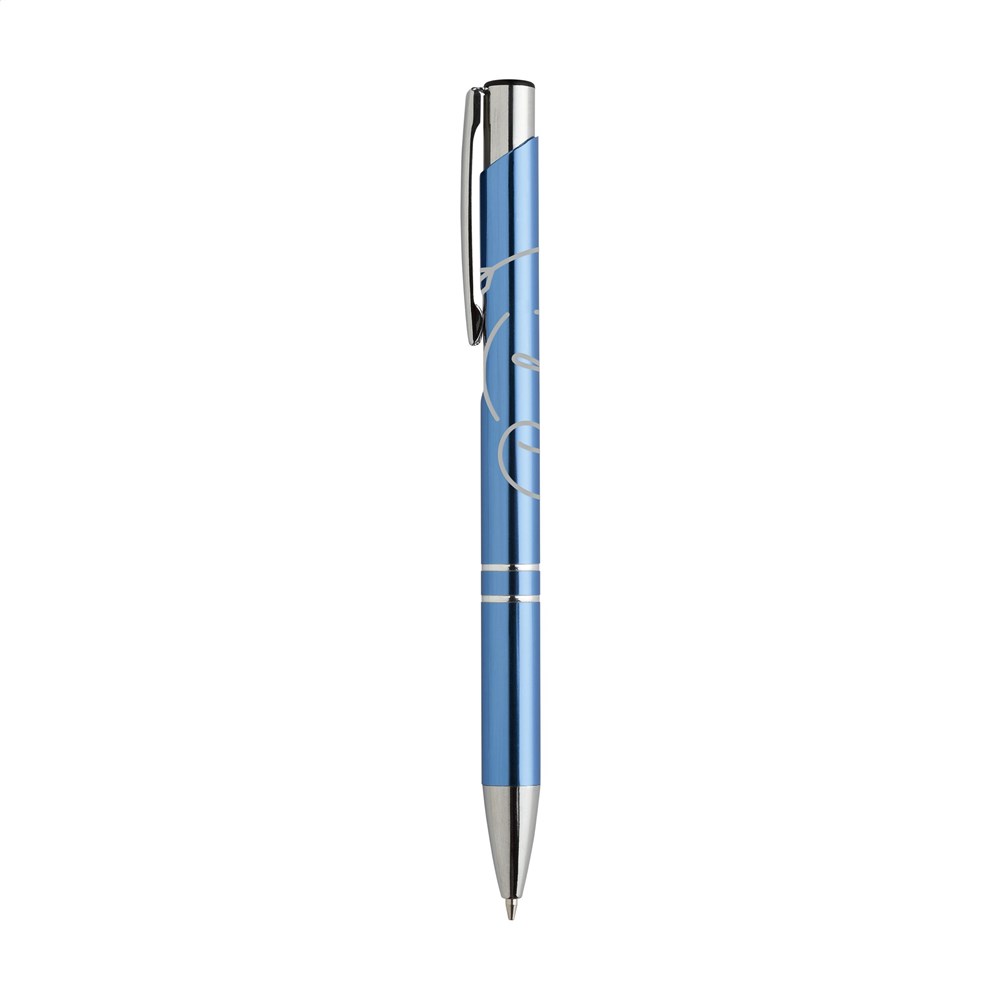 Blauschreibender Aluminiumkugelschreiber mit glänzendem Gehäuse in Metalloptik und metallenem Clip.