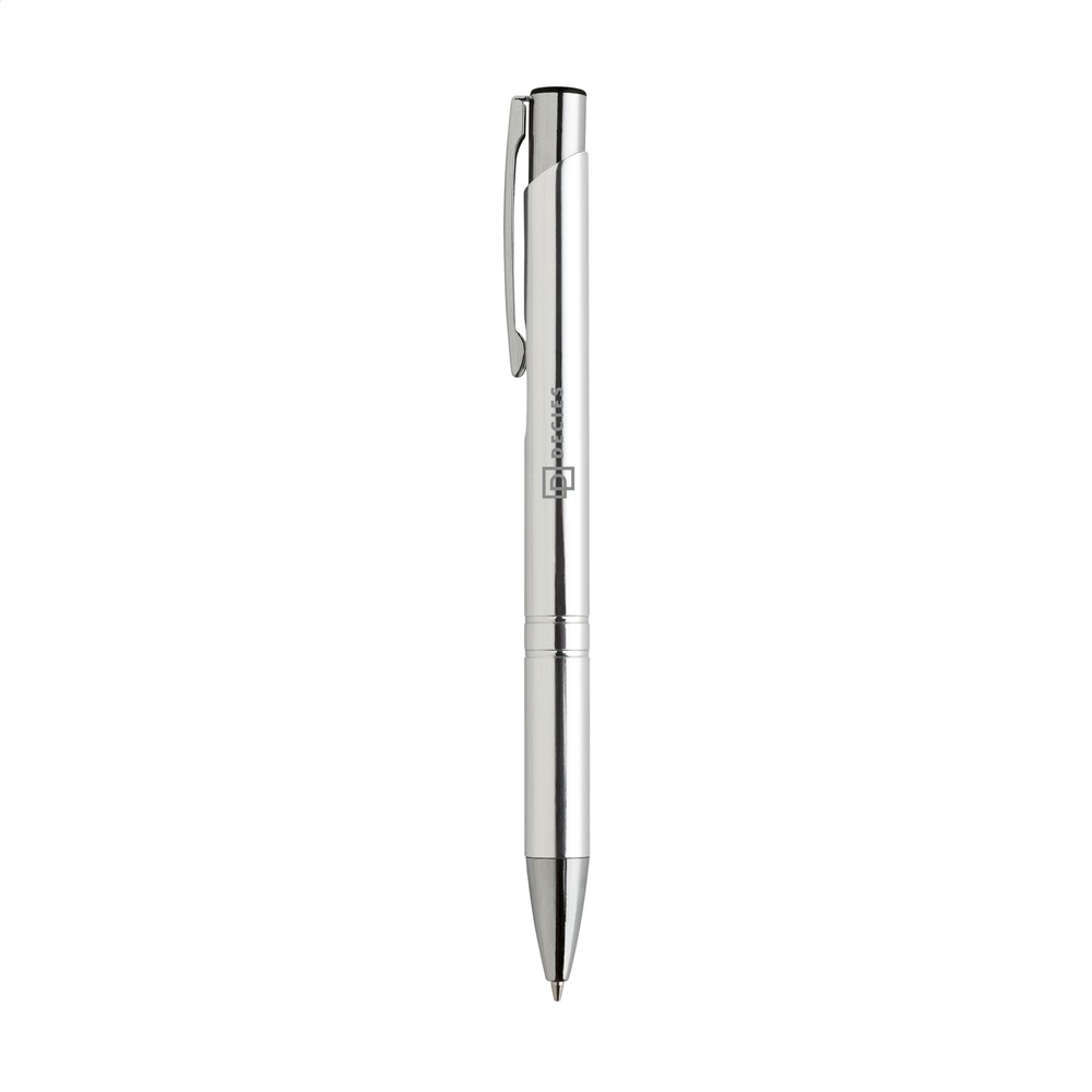 Blauschreibender Aluminiumkugelschreiber mit glänzendem Gehäuse in Metalloptik und metallenem Clip. mehr