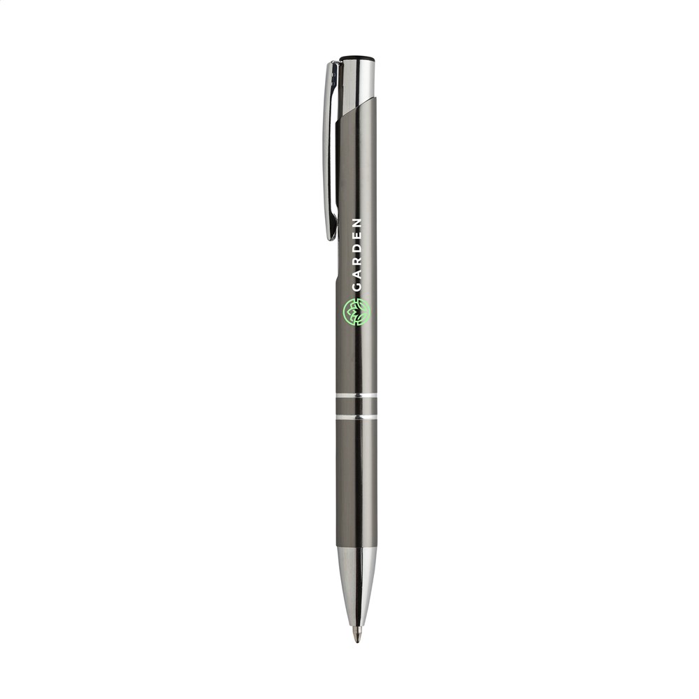 Blauschreibender Aluminiumkugelschreiber mit glänzendem Gehäuse in Metalloptik und metallenem Clip.