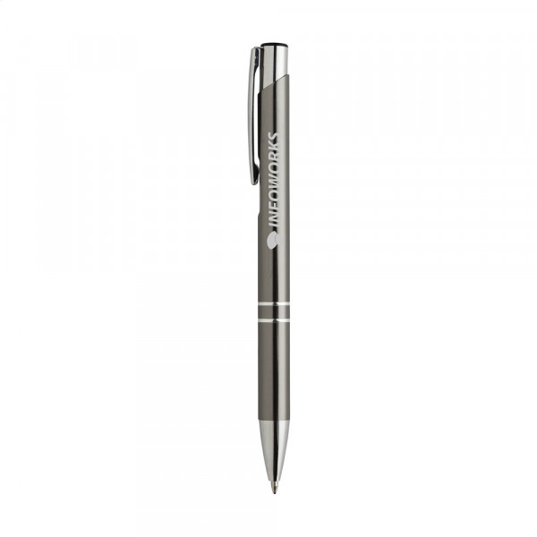Blauschreibender Aluminiumkugelschreiber mit glänzendem Gehäuse in Metalloptik und metallenem Clip. mehr