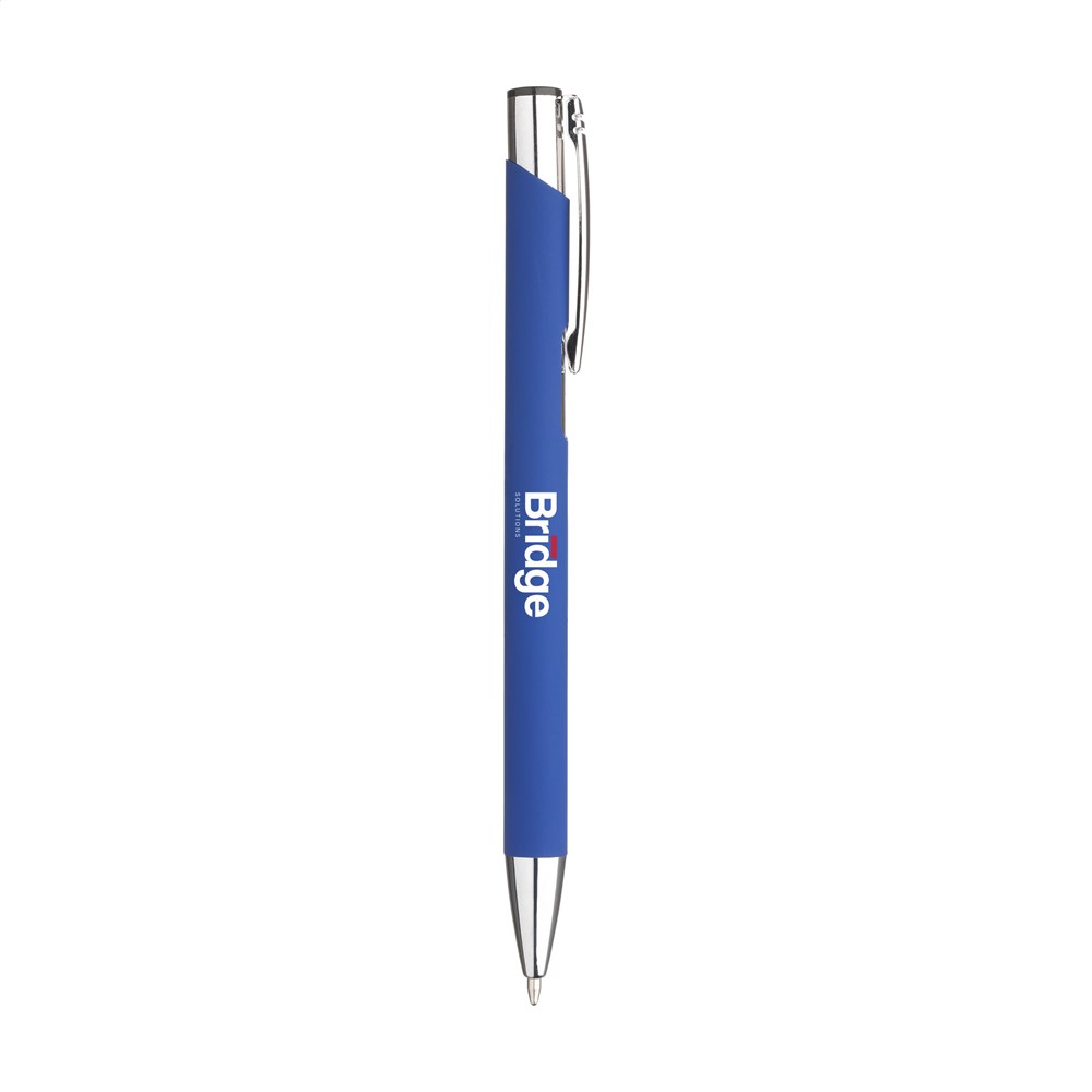 Blauschreibender Aluminium-Kugelschreiber mit Metallclip. Der Halter ist mit einer schönen gummierten Oberfläche versehen. Durch den einteiligen Halter bietet dieser Stift Platz für einen großen Aufdruck.