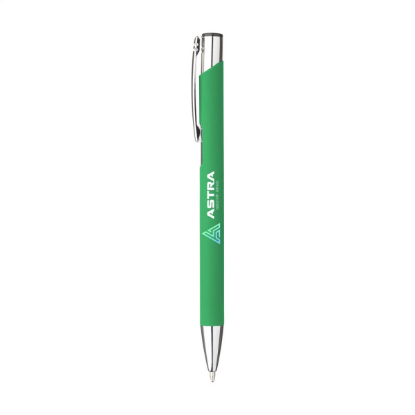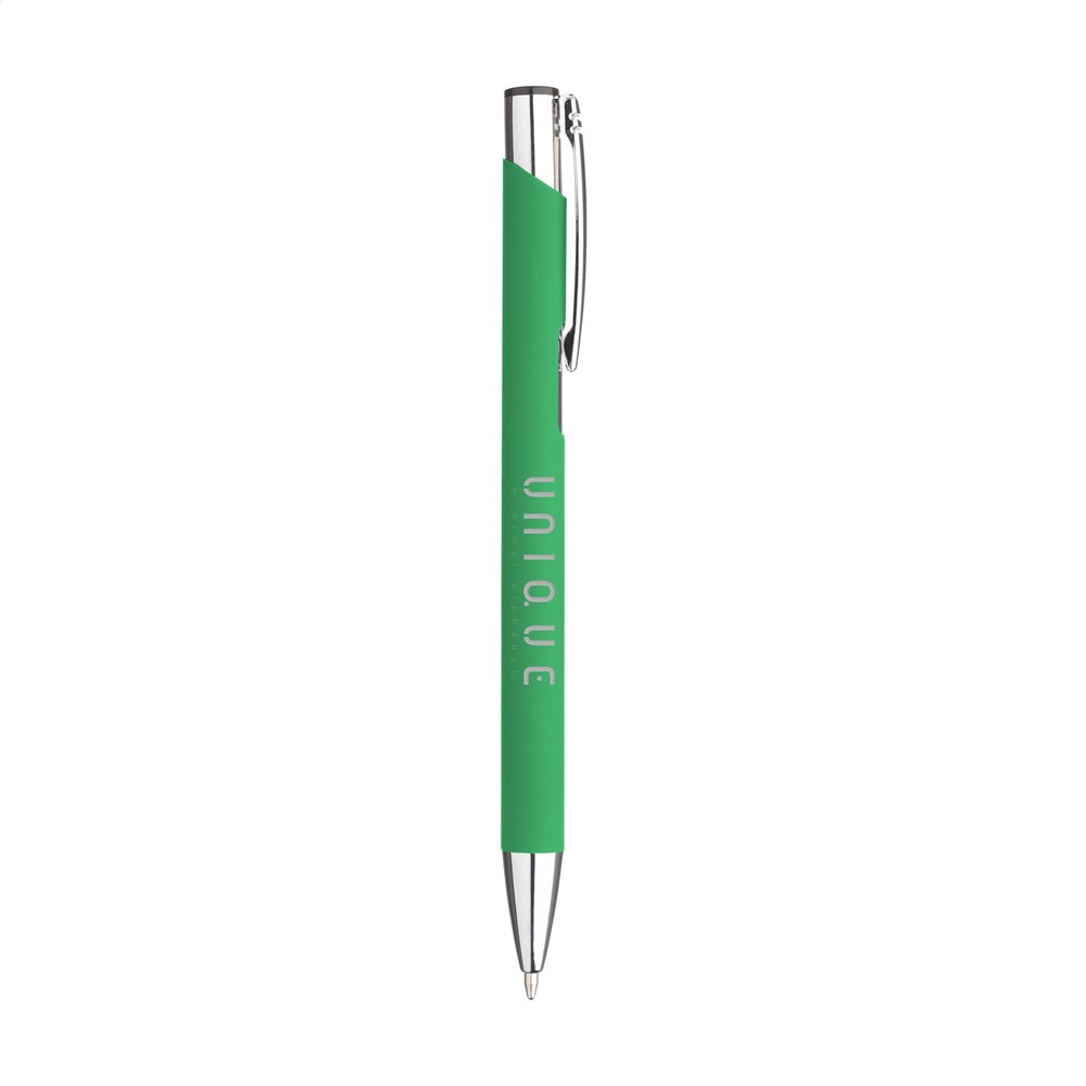 Blauschreibender Aluminium-Kugelschreiber mit Metallclip. Der Halter ist mit einer schönen gummierten Oberfläche versehen. Durch den einteiligen Halter bietet dieser Stift Platz für einen großen Aufdruck.