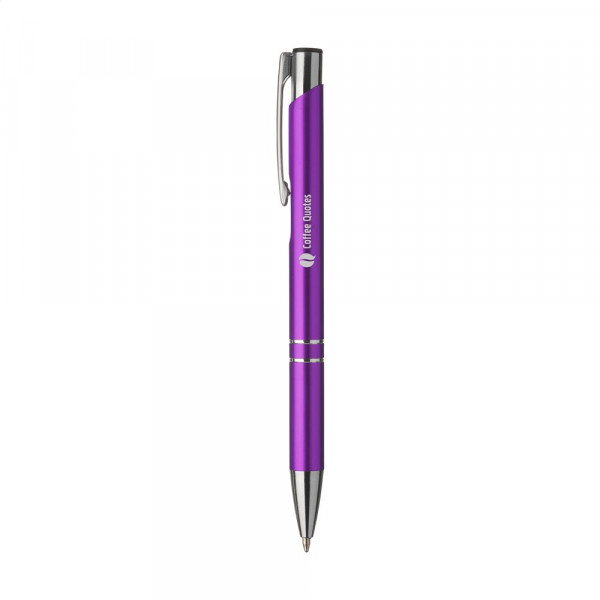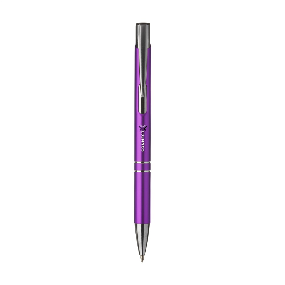 Blauschreibender oder schwarzschreibender Kugelschreiber aus Aluminium mit mattfarbenem Gehäuse in Metalloptik und metallenem Clip/Druckknopf.