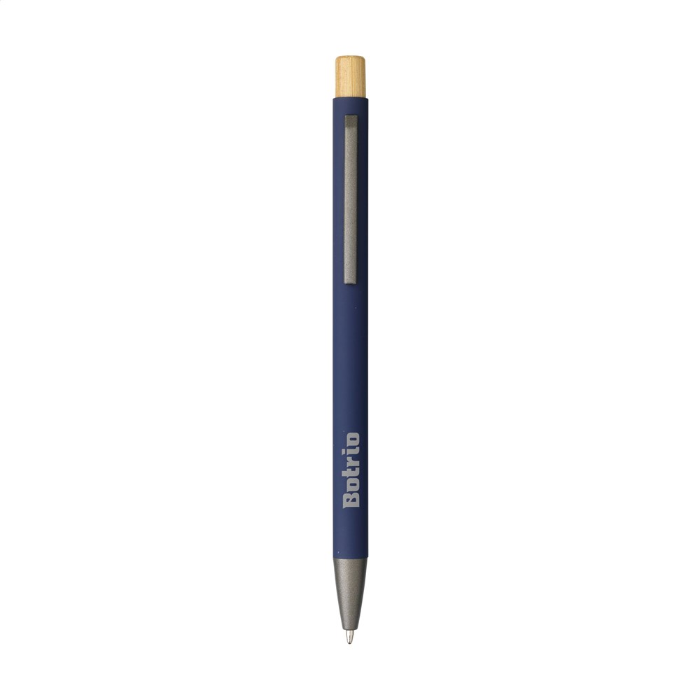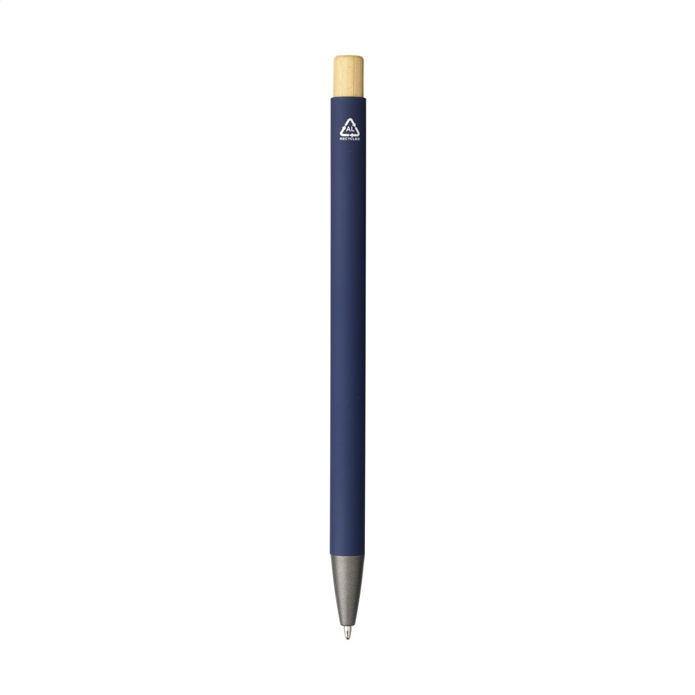 Blauschreibender, schlanker Kugelschreiber mit einem Gehäuse aus 100% recyceltem Aluminium mit gummierter Oberfläche. Metallclip. Schlankes Design. Der Bambus-Druckknopf verleiht dem Stift eine natürlicher Akzent. GRS-zertifiziert. Durch die Verwendung von recyceltem Aluminium kommt eine geringere Menge an neuen Rohstoffen zum Einsatz. Das bedeutet weniger Energieverbrauch und weniger Wasserverbrauch.