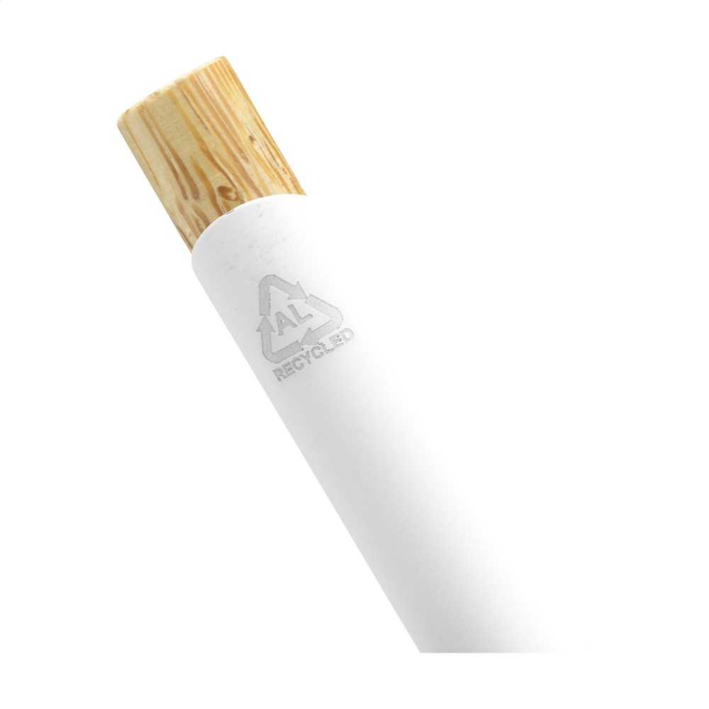 Blauschreibender, schlanker Kugelschreiber mit Gehäuse aus 100% recyceltem Aluminium mit gummierter Oberfläche und stabilem Metallclip. Die Bambusakzente verleihen dem Stift einen natürlichen Charakter. GRS-zertifiziert. Durch die Verwendung von recyceltem Aluminium kommt eine geringere Menge an neuen Rohstoffen zum Einsatz. Das bedeutet weniger Energieverbrauch und weniger Wasserverbrauch.