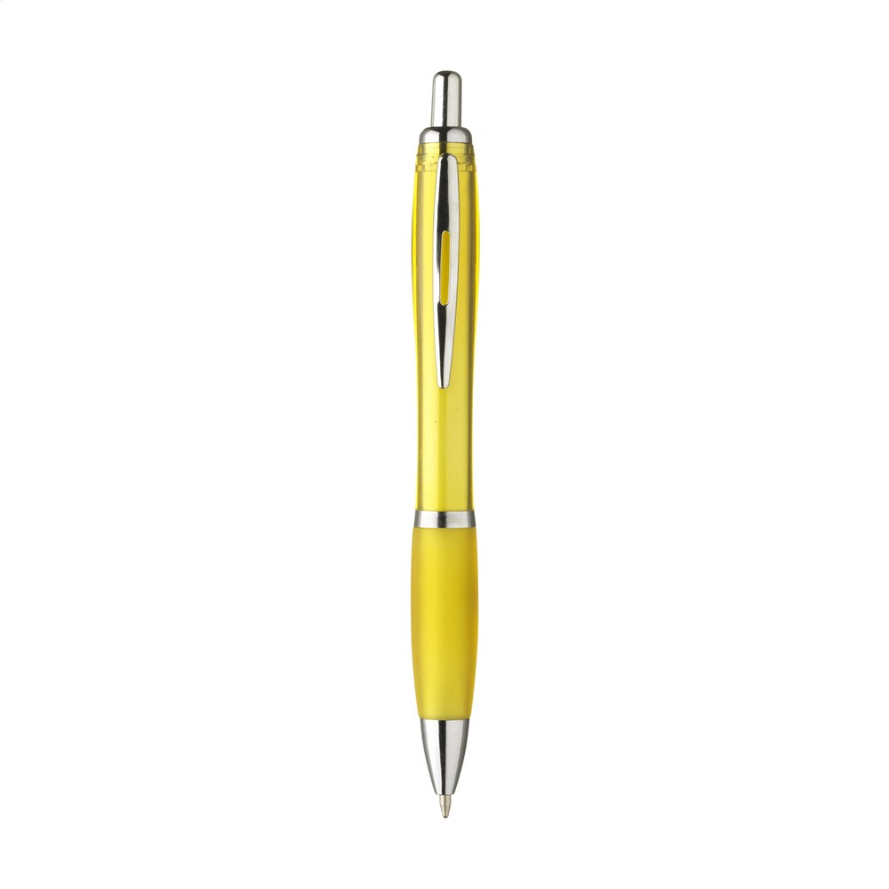 Blauschreibender oder schwarzschreibender Kugelschreiber mit transparentfarbener Gehäuse, grifffestem Vorderteil und Metallclip.