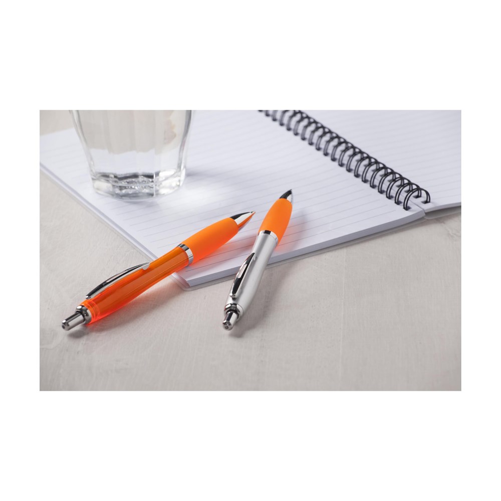 Blauschreibender oder schwarzschreibender Kugelschreiber mit transparentfarbener Gehäuse, grifffestem Vorderteil und Metallclip.
