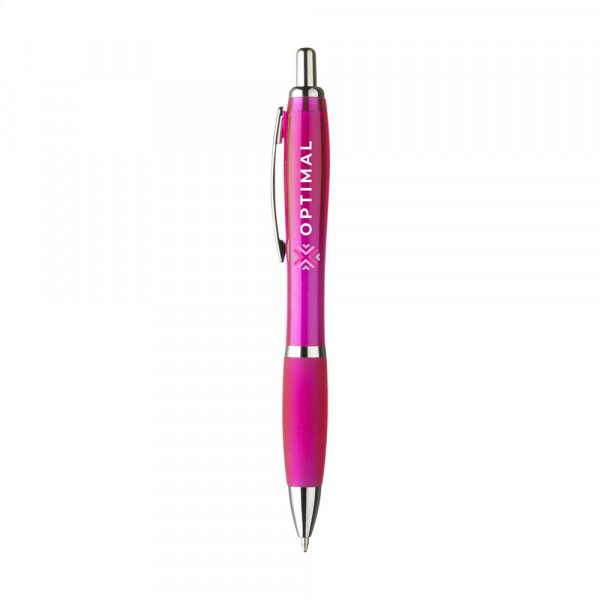Blauschreibender oder schwarzschreibender Kugelschreiber mit transparentfarbener Gehäuse, grifffestem Vorderteil und Metallclip.