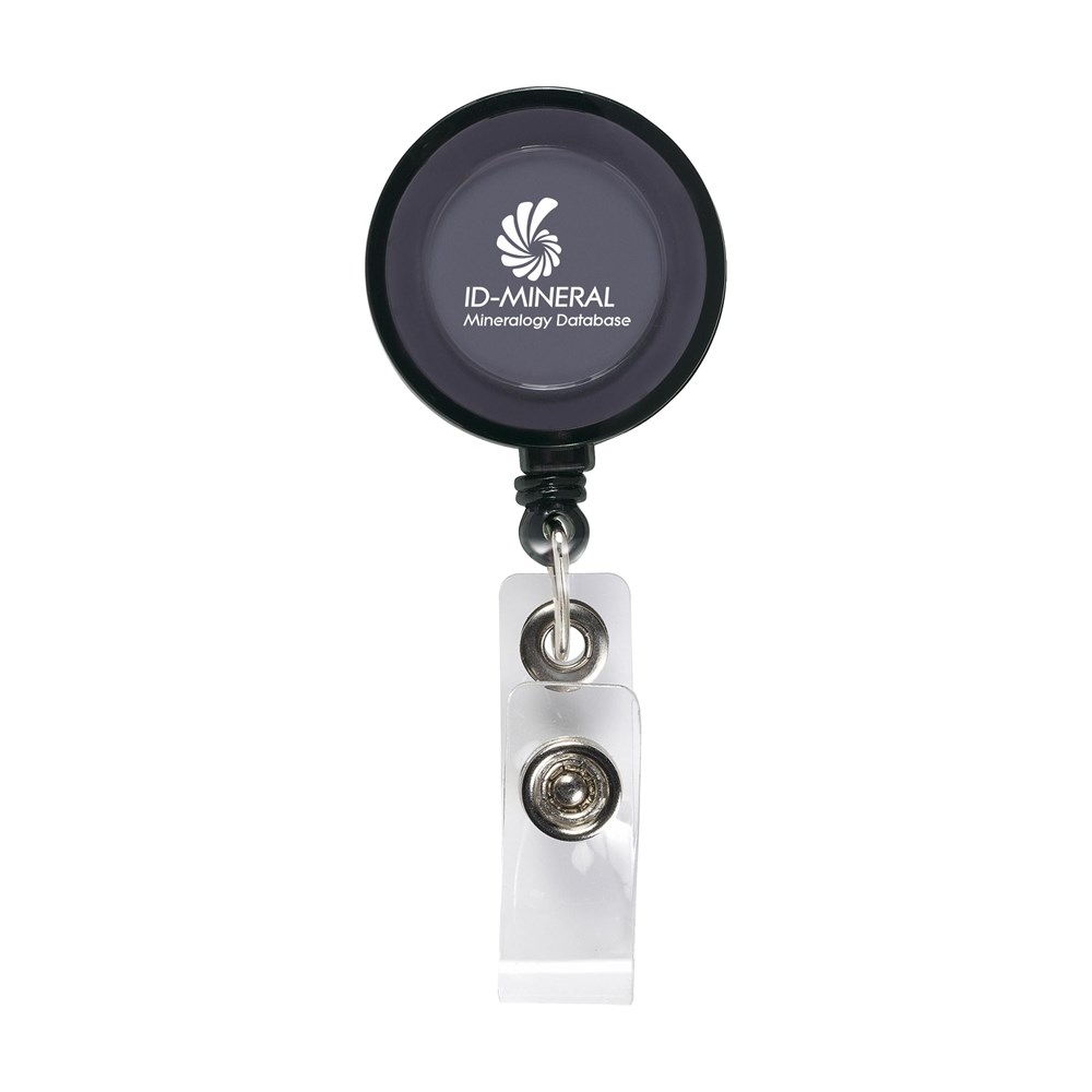 Badgehalter mit metallenem Befestigungsclip, aufrollbarem Nylonband und Badgeclip mit Druckknopf.