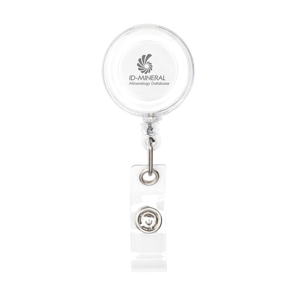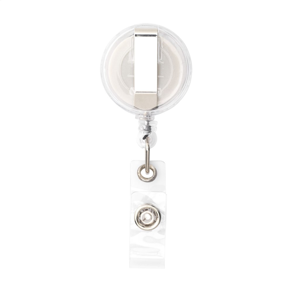 Badgehalter mit metallenem Befestigungsclip, aufrollbarem Nylonband und Badgeclip mit Druckknopf.