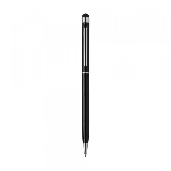 Blauschreibender Metallkugelschreiber mit gummiertem Pointer zum Bedienen von Touchscreens (wie iPhone/iPad), hochglänzenden Akzenten und Dreh-Klicksystem.