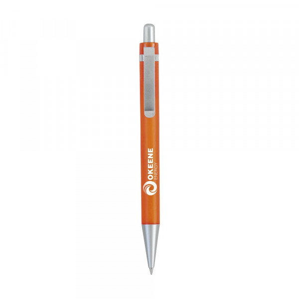 Blauschreibender Kugelschreiber mit transparentfarbenem Gehäuse und Clip aus Mattmetall. mehr