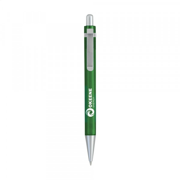Blauschreibender Kugelschreiber mit transparentfarbenem Gehäuse und Clip aus Mattmetall. mehr
