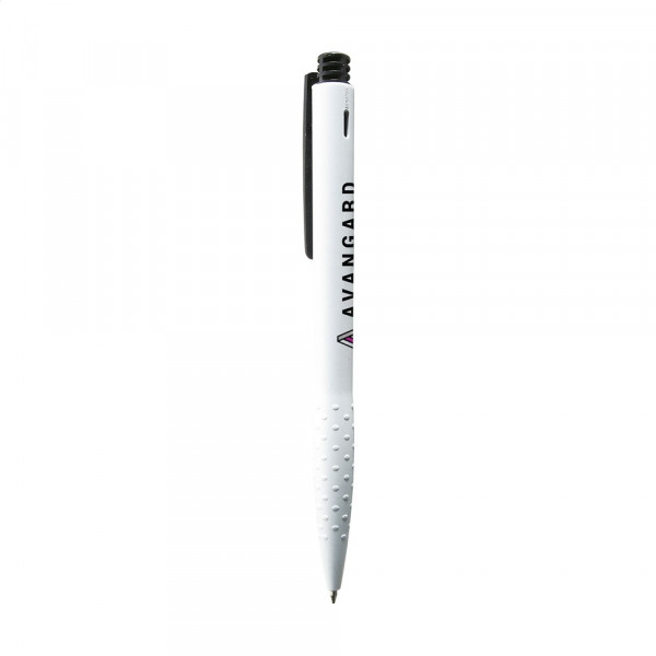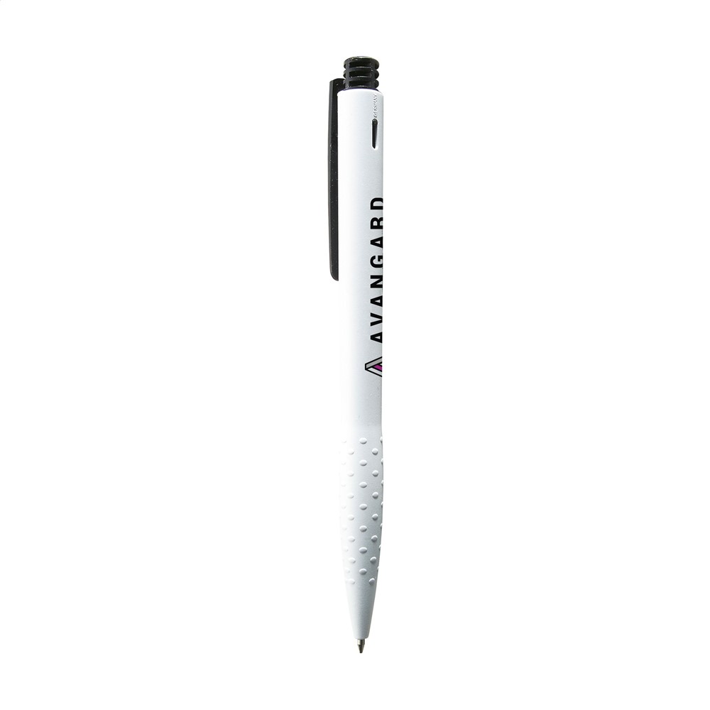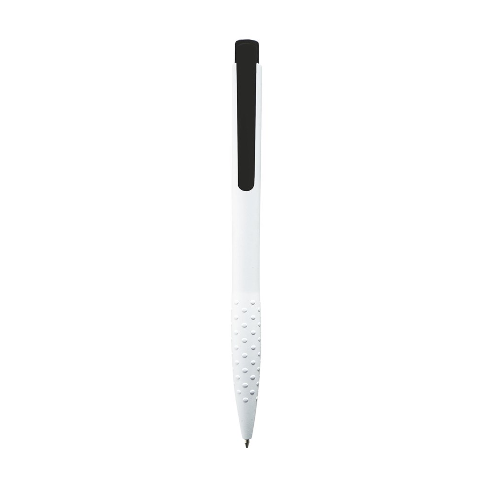 Blauschreibender oder schwarzschreibender Kugelschreiber mit grifffestem Vorderteil, farbigem Clip und Druckknopf.