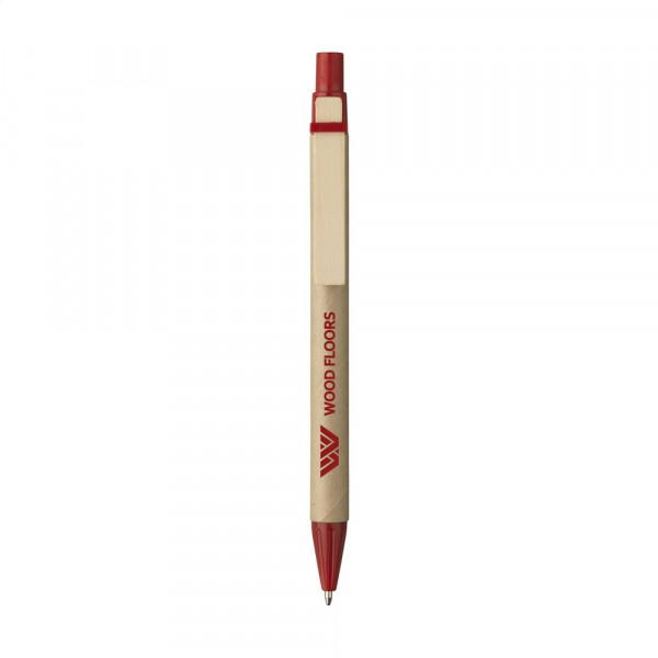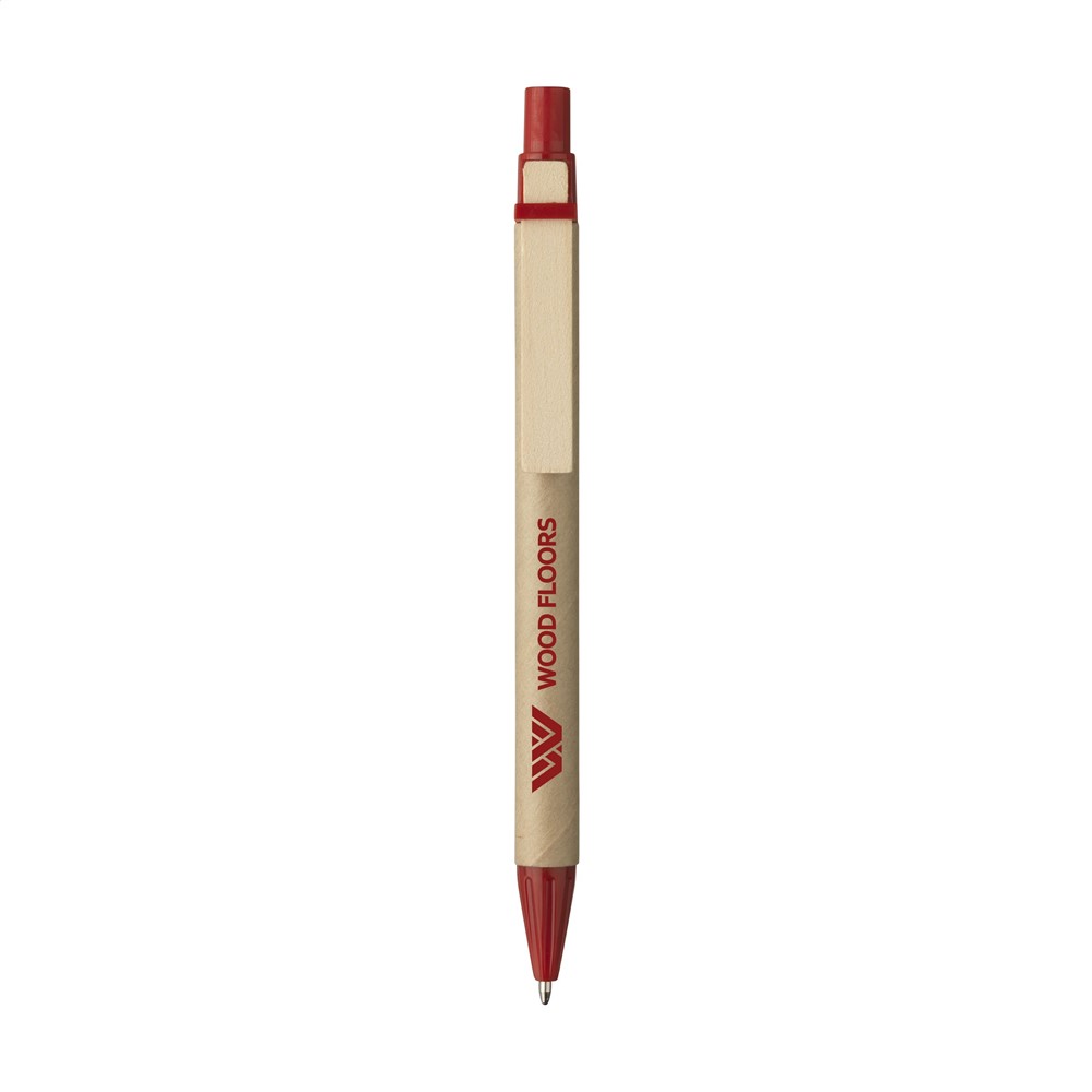 Blauschreibender Kugelschreiber mit FSC Recycled zertifiziert kartongehäus und eingefärbten Kunststoffakzenten.