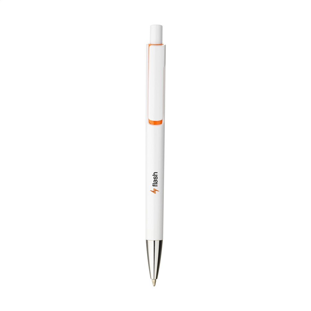 Blauschreibender Kugelschreiber mit einem Gehäuse aus recyceltem ABS. Mit einzigartigem Design: das Gehäuse und der Clip von diesem Kugelschreiber sind aus 'einem Guss', was diesen Kugelschreiber zu einem besonderen Blickfang macht. Mit auffallendem Farbakzent unter dem GRS-zertifiziert.