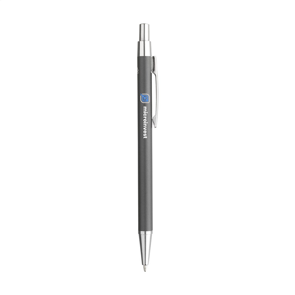 Blauschreibender Kugelschreiber mit schlankem Halter aus Aluminiumschrott. Der Halter dieses Kugelschreibers besteht zu 85% aus zertifiziertem, recyceltem Aluminium. Mit stabilem Metallclip und Druckknopf. Durch die Verwendung von recyceltem Aluminium werden bei der Herstellung dieses Produkts weniger neue Rohstoffe verwendet. Das bedeutet weniger Energieverbrauch und weniger Wasserverbrauch.