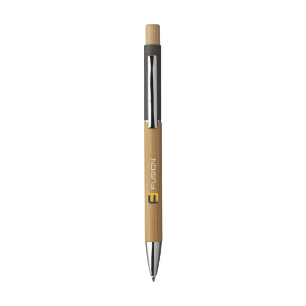 Blauschreibender Kugelschreiber mit schönem Gehäuse und Druckknopf aus FSC 100% zertifiziertem Bambus. Metallclip. Die Aluminiumoberseite des Halters ist mit einer gummierten Oberfläche versehen.
