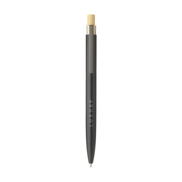 Modischer, blauschreibender Kugelschreiber mit einem Gehäuse aus 100% recyceltem Aluminium mit mattem Finish. Der Druckknopf aus Bambus ist mit einem transparenten Akzent versehen. Das Gehäuse besteht aus einem Stück und ist standardmäßig mit dem Logo 'Recycled Aluminium' bedruckt. GRS-zertifiziert. Durch die Verwendung von recyceltem Aluminium werden bei der Herstellung dieses Produkts weniger neue Rohstoffe verwendet. Das bedeutet weniger Energieverbrauch und weniger Wasserverbrauch.