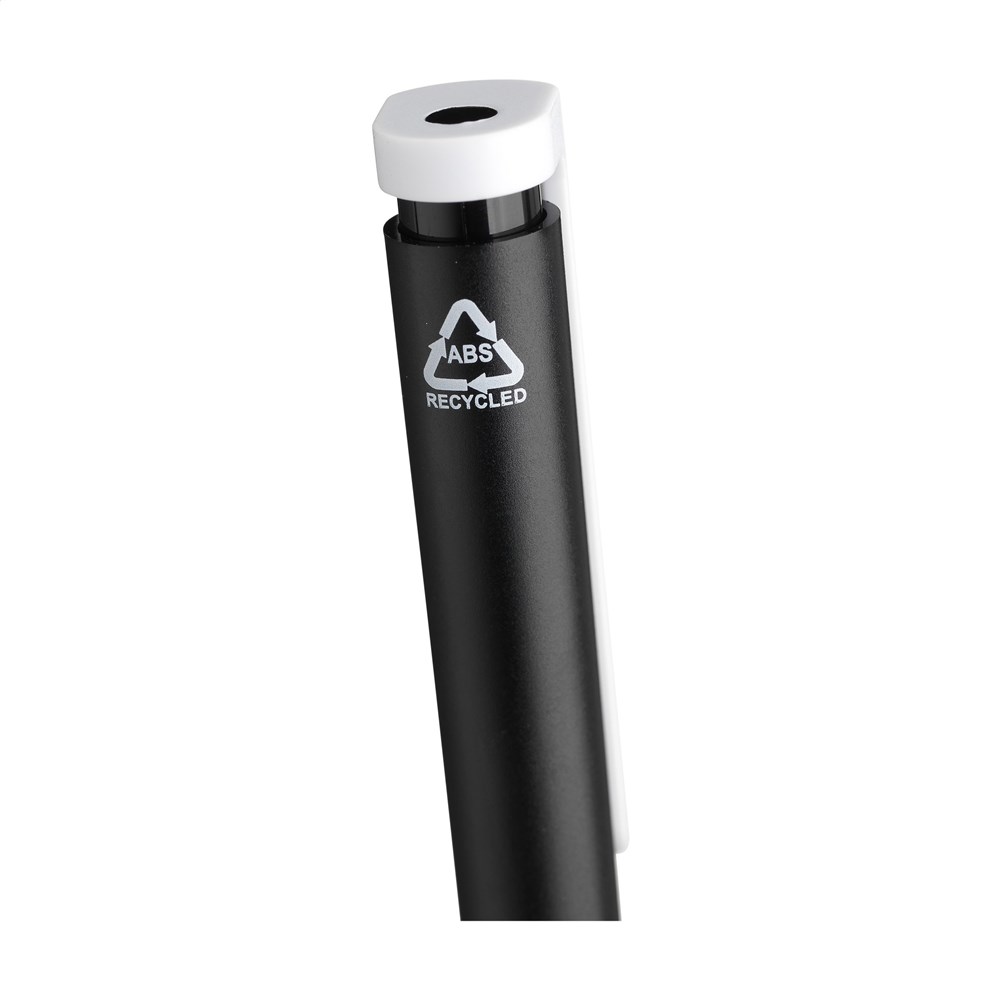 Blauschreibender Kugelschreiber mit einem Gehäuse aus 100% recyceltem ABS. Der Clip/Druckknopf ist mit einem auffälligen farblichen Akzent gestaltet und bietet Platz für einen großzügigen, digitalen Vollfarbaufdruck. GRS-zertifiziert.