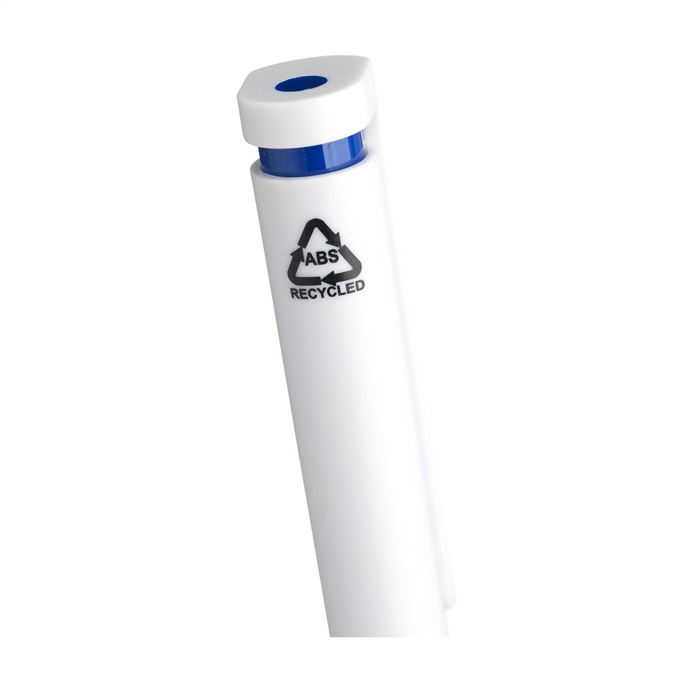Blauschreibender Kugelschreiber mit einem Gehäuse aus 100% recyceltem ABS. Der Clip/Druckknopf ist mit einem auffälligen farblichen Akzent gestaltet und bietet Platz für einen großzügigen, digitalen Vollfarbaufdruck. GRS-zertifiziert.