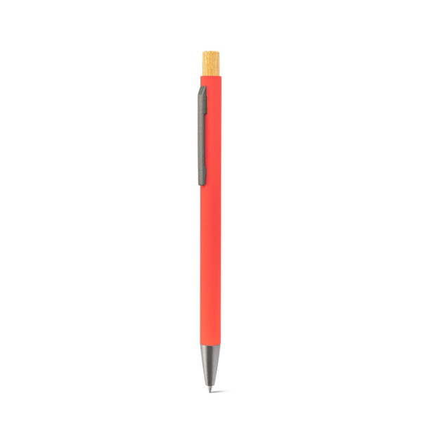 Recycelter Aluminium-Kugelschreiber (100% RAL) mit Gummibeschichtung. Sein minimalistisches Design kombiniert matte metallgraue Details mit einem Bambusknopf an der Oberseite. Er hat einen Clip und blauschreibende Mine. Bei einer Lasergravur wird die Veredelungsfarbe Silber. Da das Produkt aus natürlichen Materialien hergestellt wird, können Farbe des Produkts sowie das Druckergebnis von Produkt zu Produkt unterschiedlich sein. ø9 x 135 mm