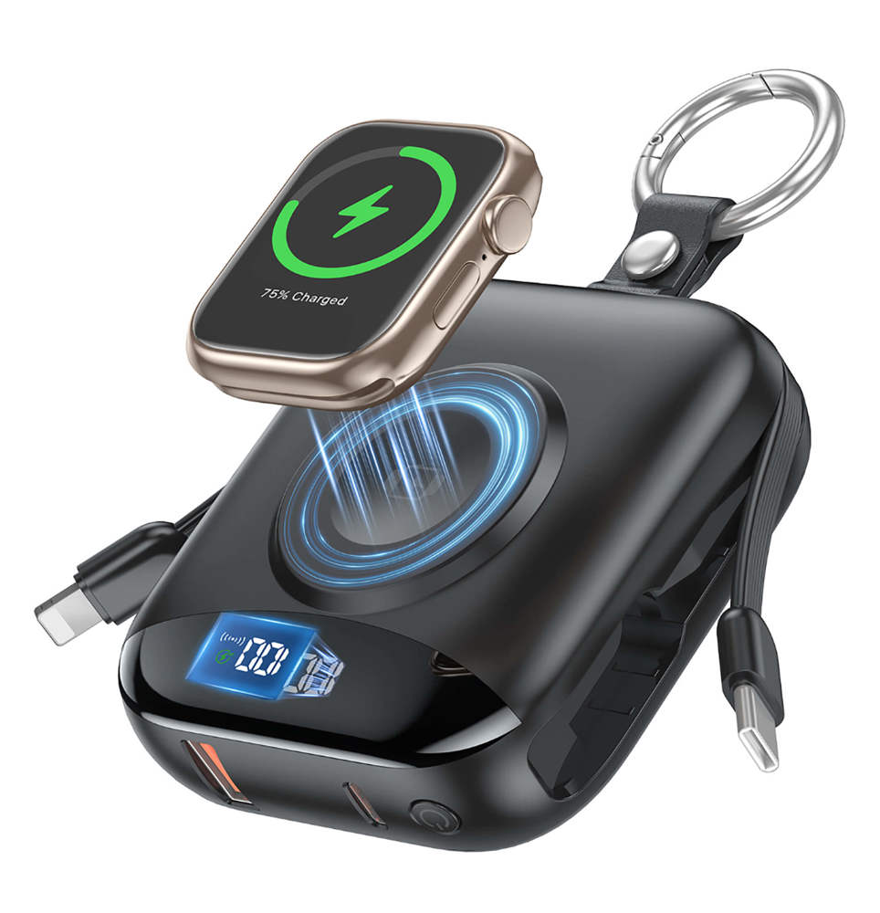 Die Orbit Powerbank bietet maximale Funktionalität auf minimalem Raum. Ausgestattet mit 10.000 mAh Kapazität, zwei integrierten Ladekabeln und einem kabellosen Ladepad für Apple Watches ist sie ein ideales All-in-One-Werkzeug für den mobilen Alltag – kompakt genug für den Schlüsselbund.